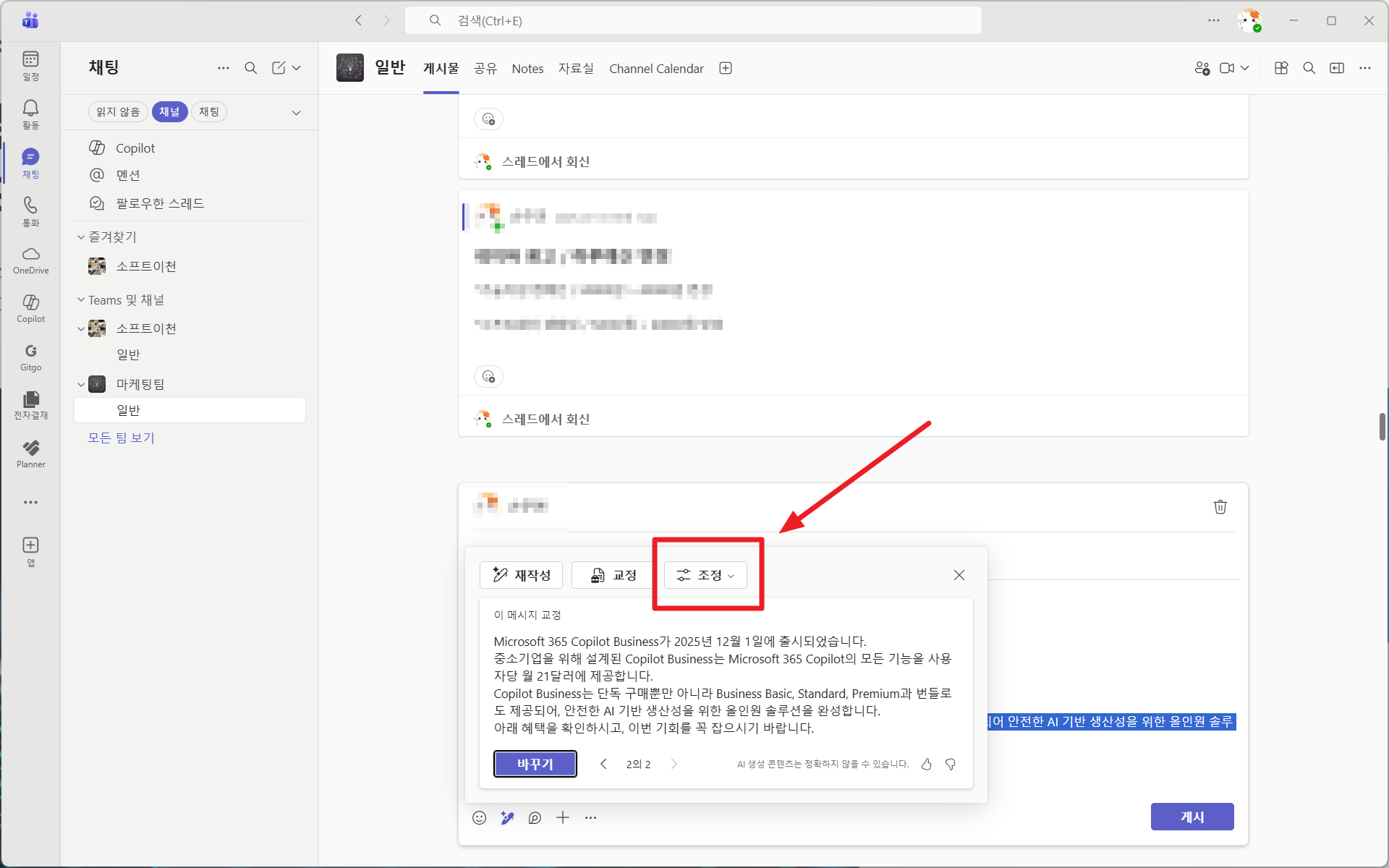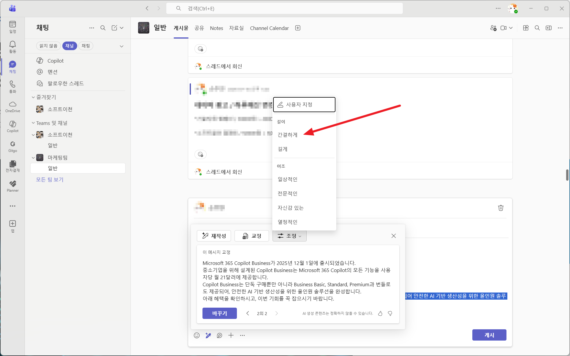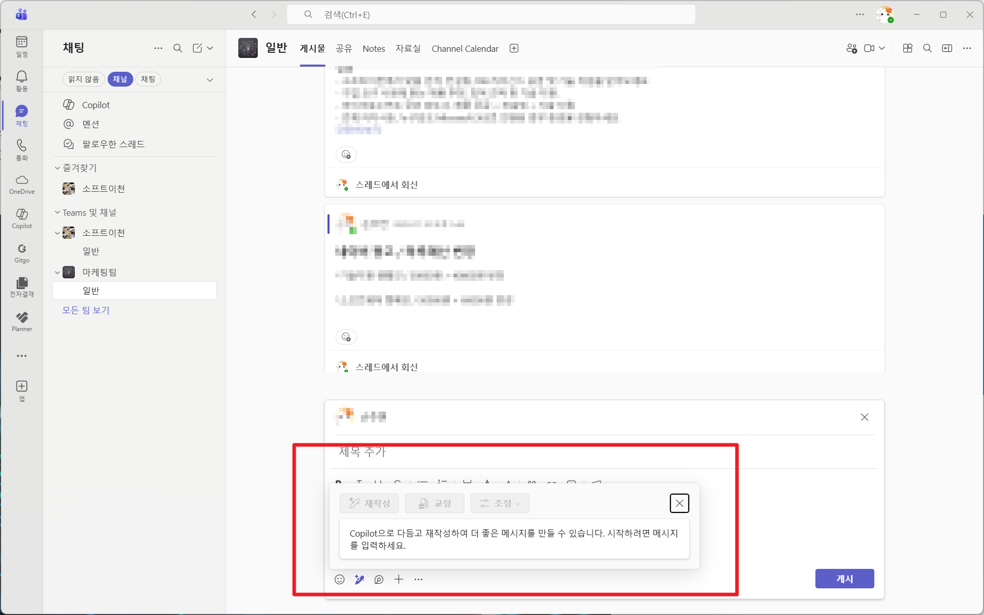 Copilot은 채널 글 작성, 요약, 톤 조정 등 다양한 작업을 도와