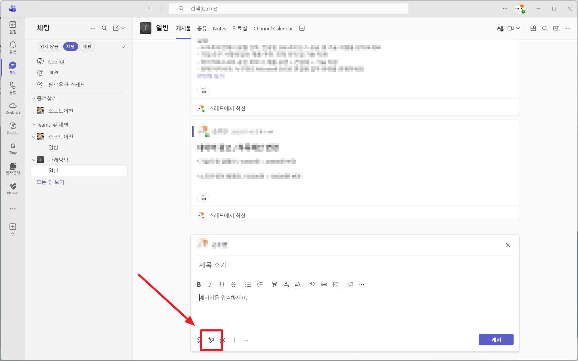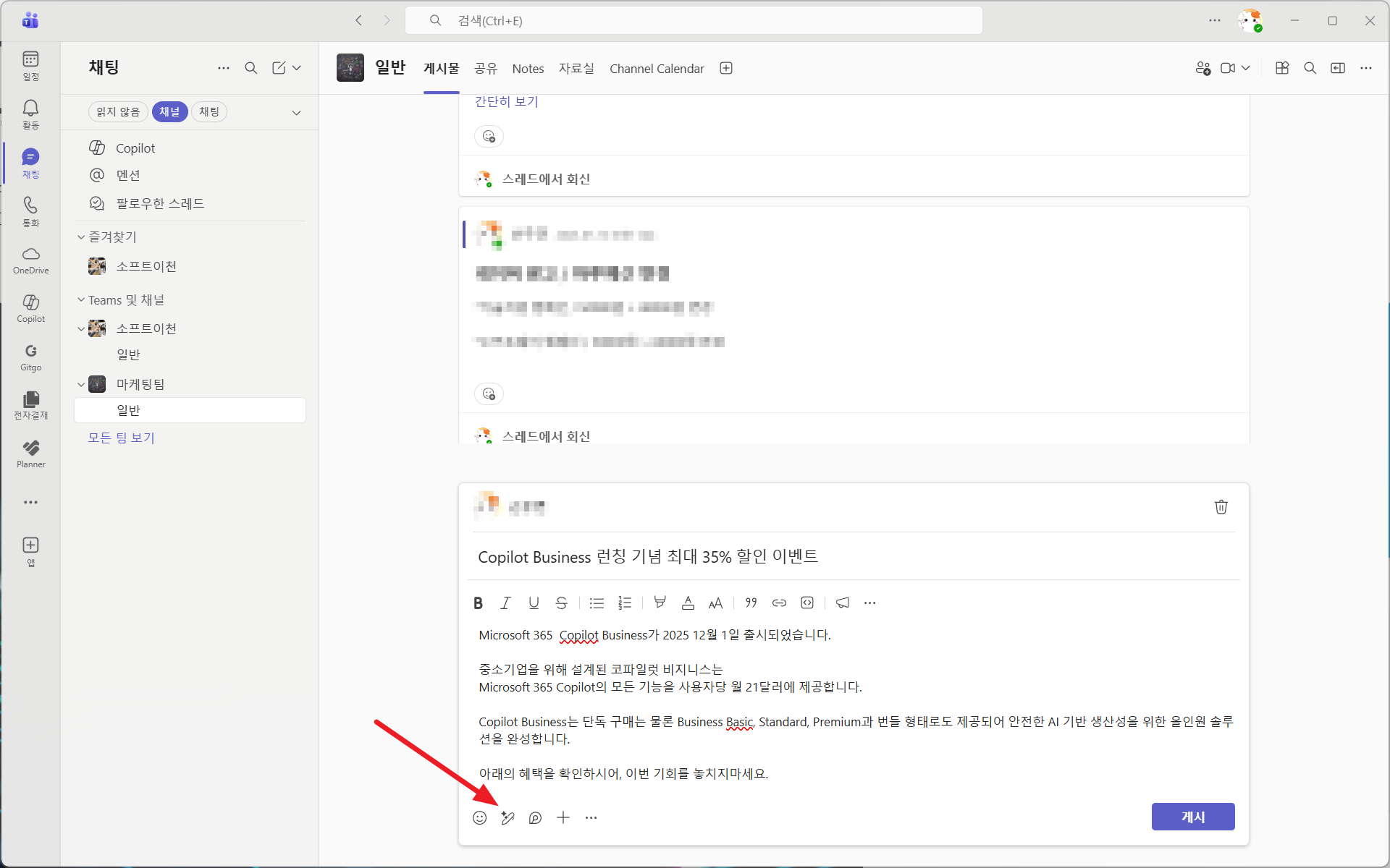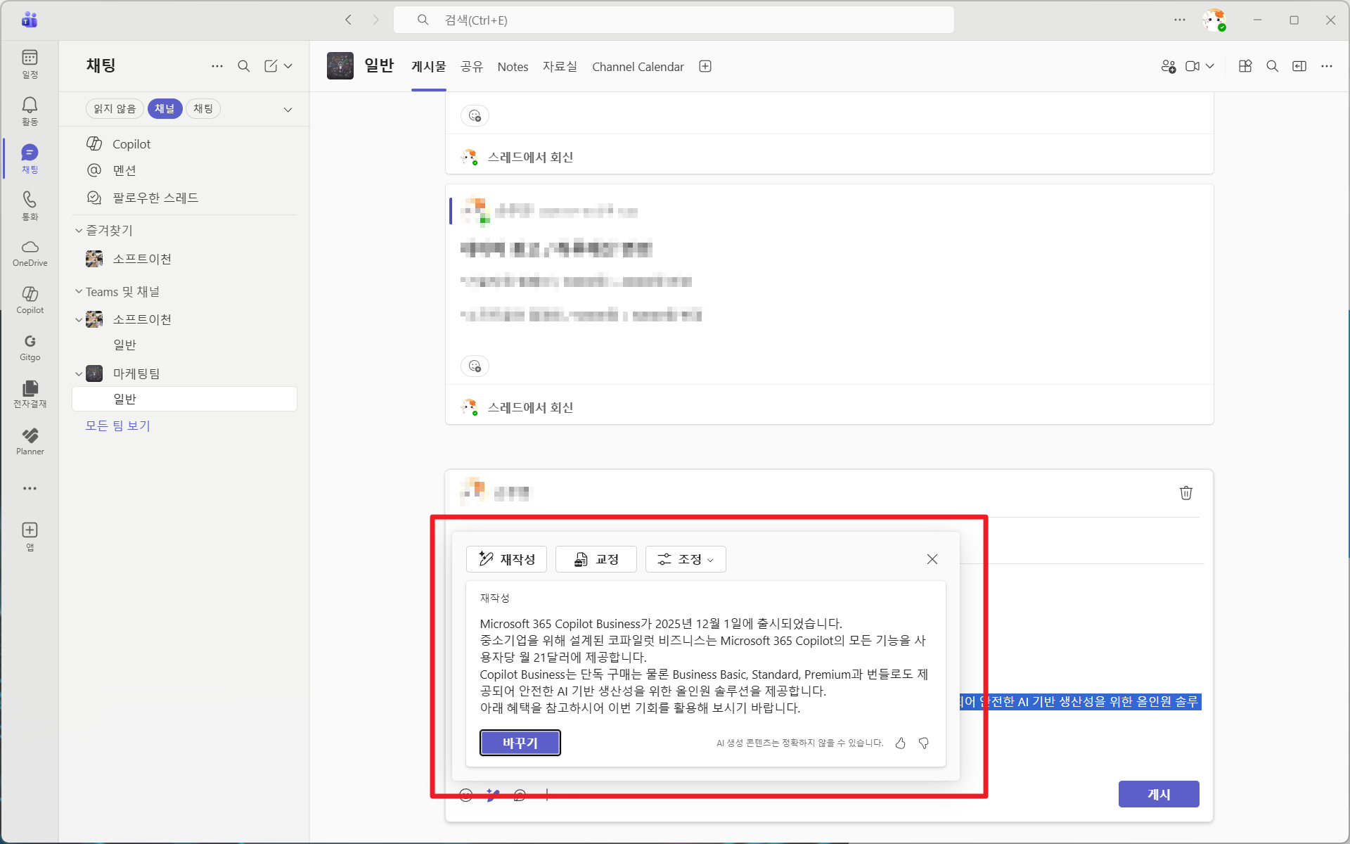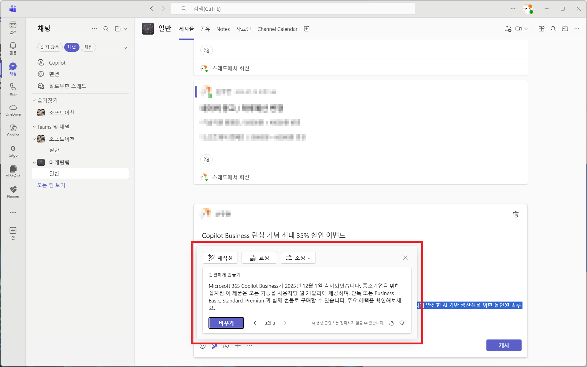 Copilot은 채널 글 작성, 요약, 톤 조정 등 다양한 작업을 도와