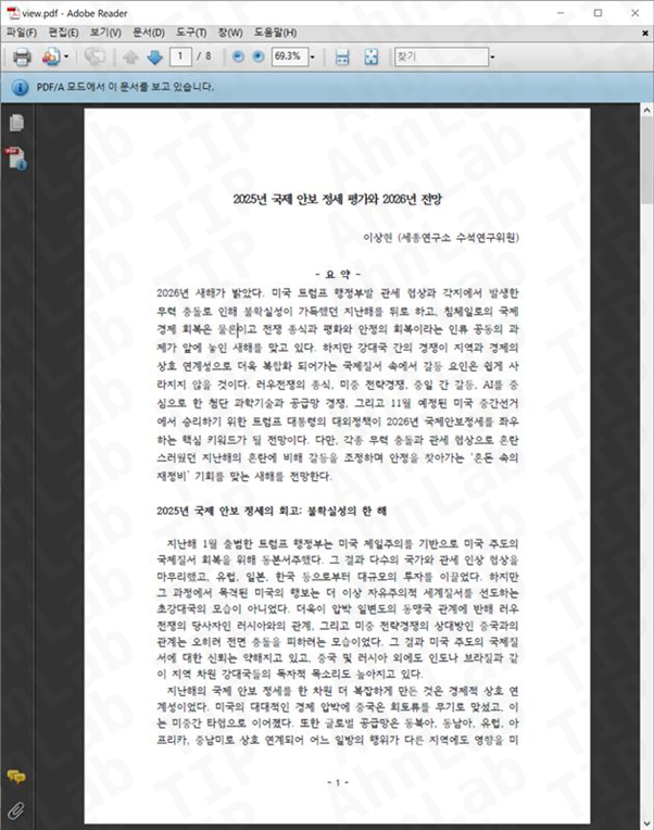 안랩이 최근 "국제 안보 정세 평가와 26년 전망 보고서"로 위장한 LNK 파일을 통해 악성코드가 유포되는 정황을 확인했다. 확인된 파일명은 다음과 같다.
