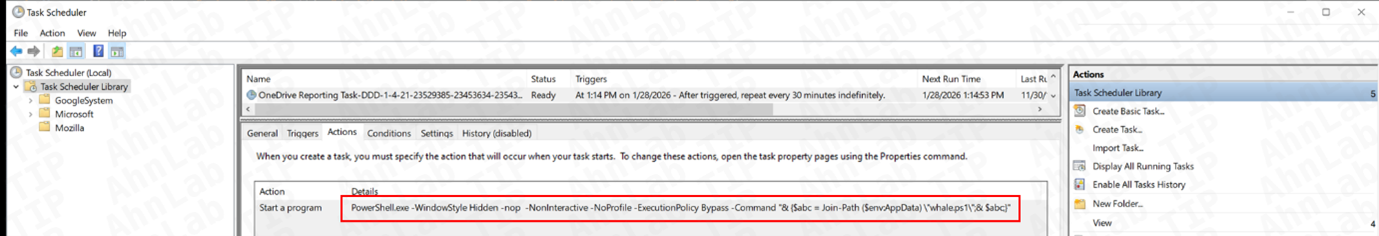 한편, 공격자는 지속적인 실행을 위해 추가 파워셸 스크립트를 %APPDATA%\whale.ps1 경로에 생성하고, 작업 스케줄러에 다음 이름의 항목을 등록한다. 해당 스케줄러는 whale.ps1 파일을 5분 후 1회 실행한 뒤, 이후 30분 간격으로 반복 실행되도록 설정돼 있다.