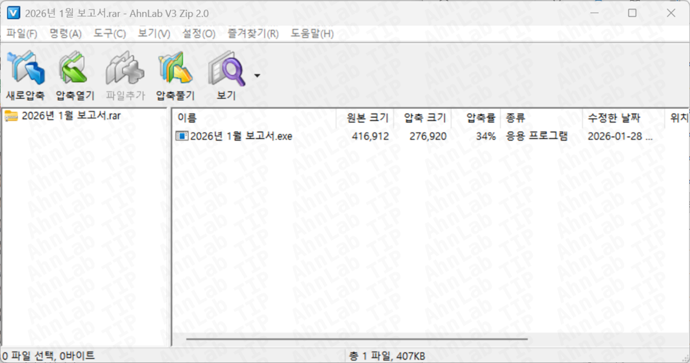 [그림 1]과 같이 해당 메일에는 "2026년 1월 보고서.rar" 라는 이름의 RAR 압축 파일이 첨부돼 있으며, 압축 파일 내부에는 “2026년 1월 보고서.exe”라는 NSIS 기반 실행 파일이 포함돼 있다.