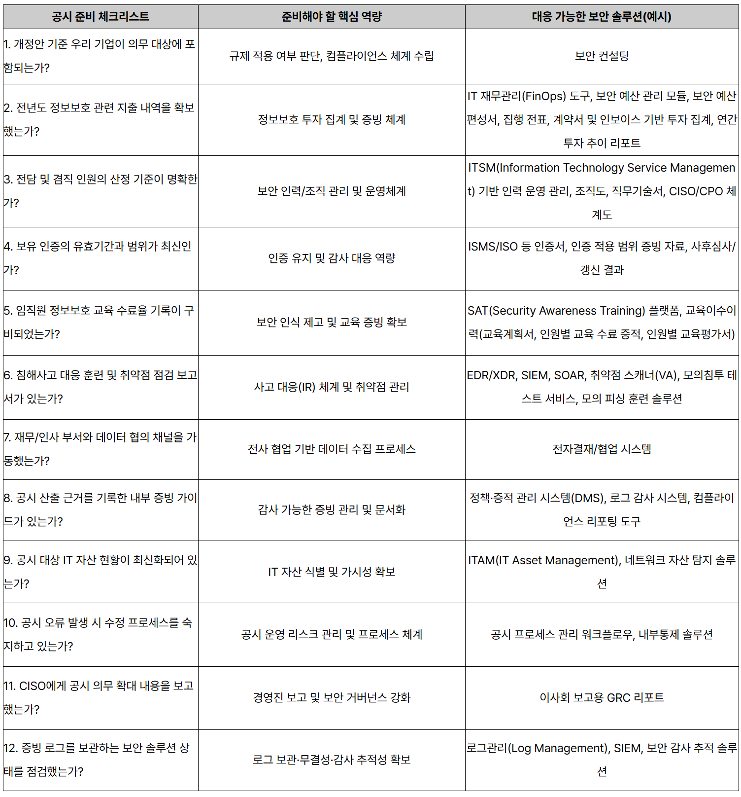 [표 2]는 정보보호 공시 의무 확대에 대비해 기업들이 실무적으로 점검해야 할 체크포인트 12개를 정리한 것이다. 각 항목은 증빙 가능한 형태로 관리되고 있는지를 기준으로 확인해야 한다. 또한, 공시 대응 과정에서 요구되는 핵심 역량과 이를 뒷받침할 수 있는 보안 솔루션 유형(예시)을 함께 제시해, 실무자가 준비 방향을 한눈에 파악할 수 있도록 구성했다.