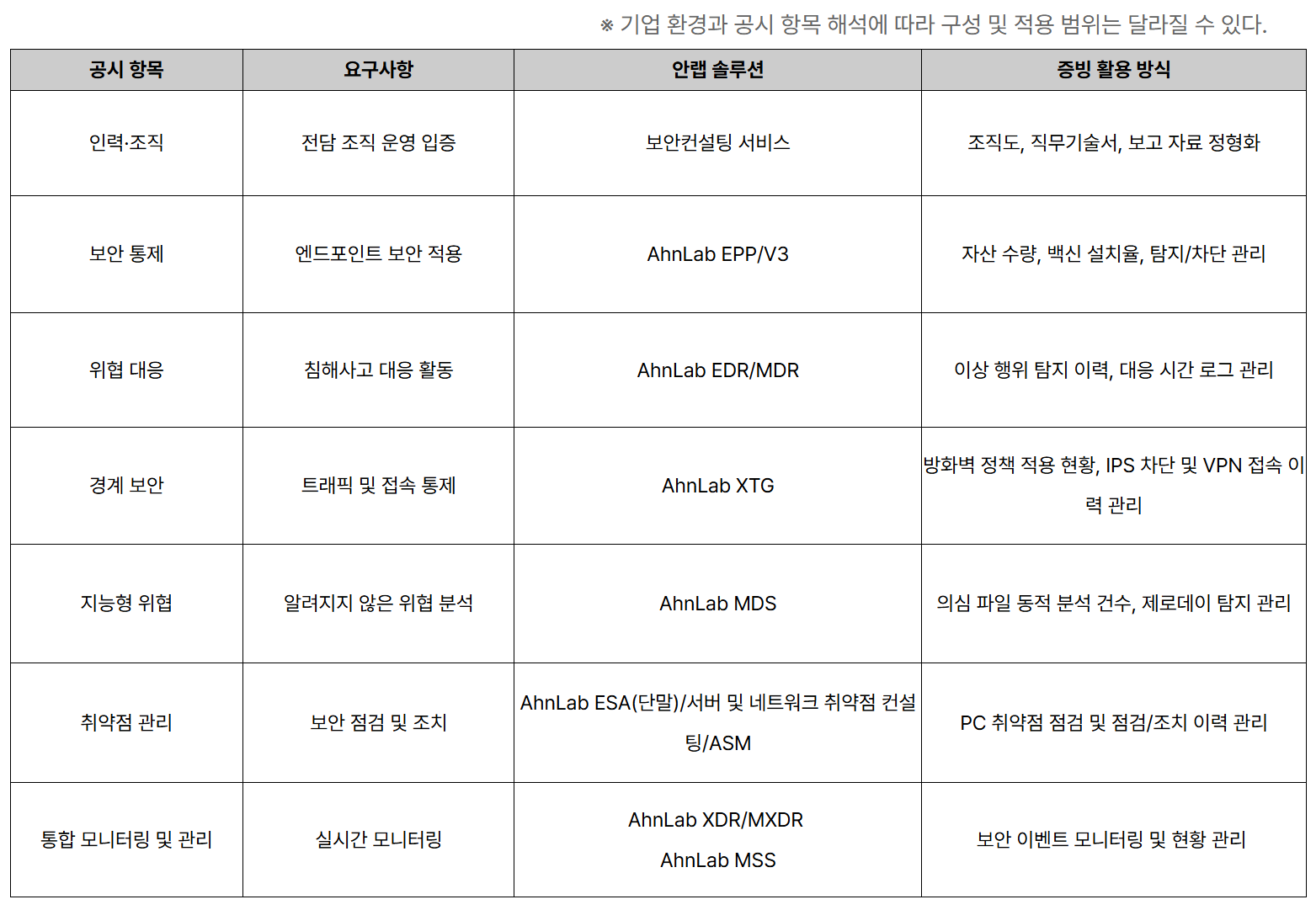 [표 3] 정보보호 공시 항목별 요구사항과 안랩 솔루션 매핑 예시