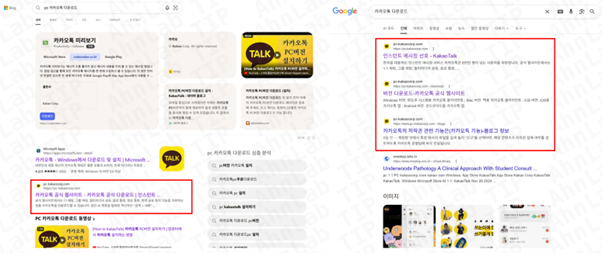 [그림 2] 검색 엔진 상단에 노출되는 가짜 카카오톡 사이트(Bing & Google)