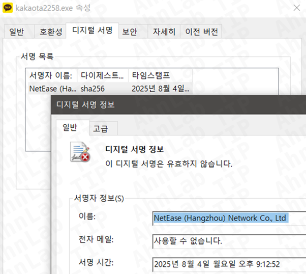 가짜 사이트에서 설치 파일을 다운로드하면 [그림 4]와 같이 카카오톡 아이콘을 사용하는 실행 파일이 설치된다. 하지만 해당 파일의 디지털 서명은 카카오에서 발급한 공식 인증서가 아니라 중국 인터넷 기술 기업 ‘NetEase’ 이름의 유효하지 않은 인증서로 서명돼 있다. 즉, 겉모습은 카카오톡 설치 파일처럼 보이지만, 실제로는 정상 설치 파일이 아닌 것이다.
