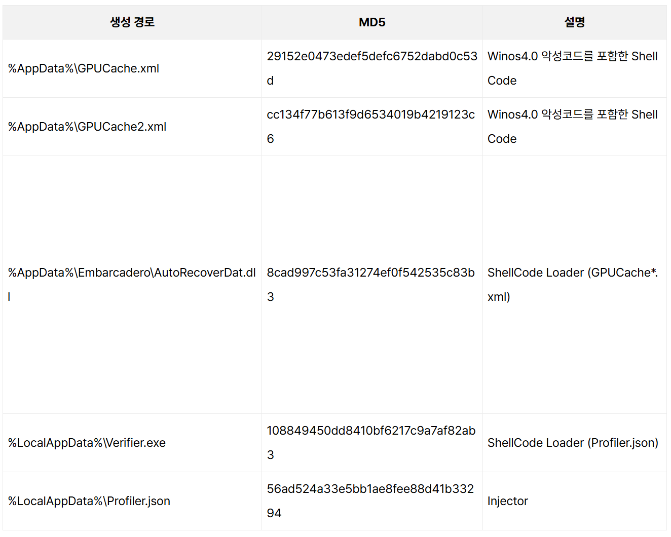 .xml 확장자를 가진 일부 파일은 쉘코드(ShellCode) 형태이며, Verifier.exe 파일은 이 쉘코드를 메모리에 올려 실행하는 로더(Loader) 역할을 수행한다. 파일 생성 경로와 기능 정보는 [표 1]과 같다.