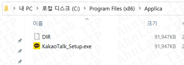 공격자는 사용자가 실제 카카오톡 설치 파일이 실행된 것으로 착각하도록 정상 카카오톡 설치 파일을 C:\Program Files (x86)\Applica 경로에 생성하고 바탕화면에 바로가기 파일(.lnk)을 생성한다.