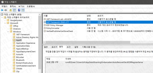 악성코드 실행 시 아래 작업 스케줄러가 생성돼 시스템 부팅 시 자동으로 실행되도록 설정된다. 만약 아래 경로로 작업 스케줄러가 생성돼 있다면 삭제해야 한다.