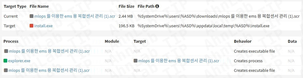 이번 공격은 스피어 피싱을 통해 시작된 것으로 추정된다. 공격자는 SCR 확장자 파일이나 7Zip SFX 형태의 드로퍼를 활용해 정상 문서나 프로그램으로 위장했다. 예를 들어 “MLOps를 이용한 EMS용 복합센서 관리.scr”과 같은 파일명은 논문이나 업무 자료로 보이도록 구성된 사례로 확인됐다.
