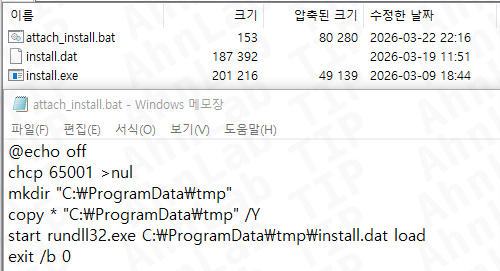 또한 “delfino-update.exe”는 내부에 다수의 악성코드를 포함한 설치 파일 형태로 유포됐다. 이들 드로퍼는 실행 시 “attach_install.bat”과 “install.exe” 등의 런처를 통해 최종적으로 rundll32를 이용해 HelloLoader(install.dat)를 실행한다. 이후 지속성 유지를 위해 Run 레지스트리에 실행 명령을 등록하는 방식이 사용됐다.