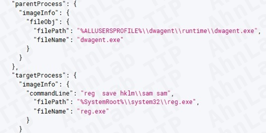 공격자는 원격 제어를 위해 백도어 외에도 DWAgent를 사용한 정황이 확인됐으며, HelloLoader 설치- 이후 DWAgent를 통해 SAM을 덤프하는 명령이 수행됐다.