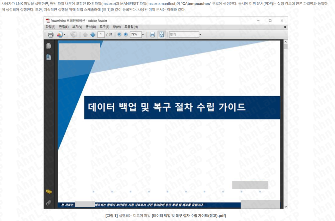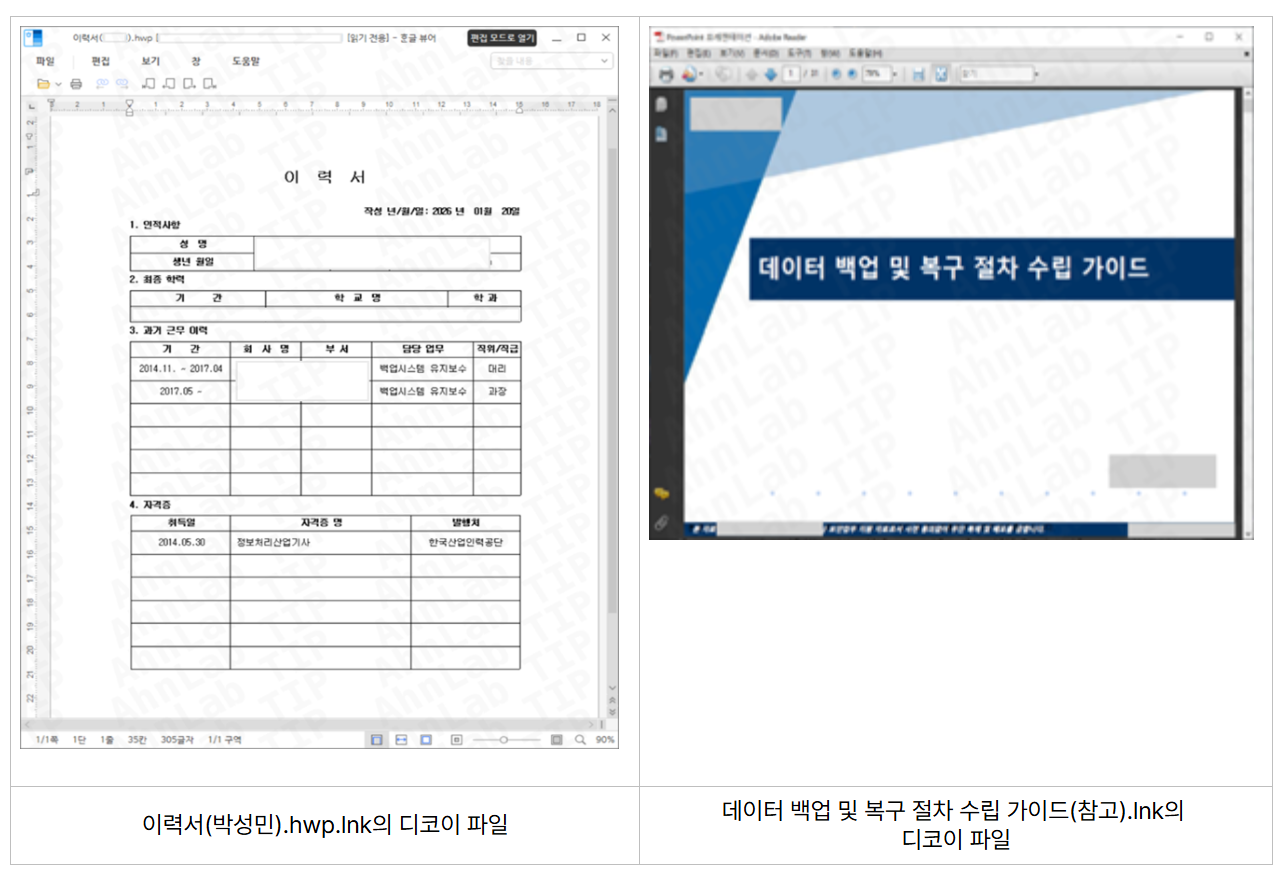 최근 유포된 LNK 파일인 “이력서(박성민).hwp.lnk” 및 “데이터 백업 및 복구 절차 수립 가이드(참고).lnk”는 과거에 유포된 사례와 동일하게 파워셸 스크립트를 실행하며, C:\windirr 경로에 숨김 및 시스템 속성을 가진 폴더를 생성한다. 이는 사용자의 일반적인 파일 탐색 과정에서 해당 경로가 노출되지 않도록 하기 위한 은닉 목적의 행위로 추정된다. 이후 해당 폴더에 LNK가 담고 있던 파일들을 생성 및 실행한다. 생성된 파일들 중에는 정상 디코이 파일이 있으며, LNK 파일명을 그대로 사용하는 HWP 문서가 생성된다.