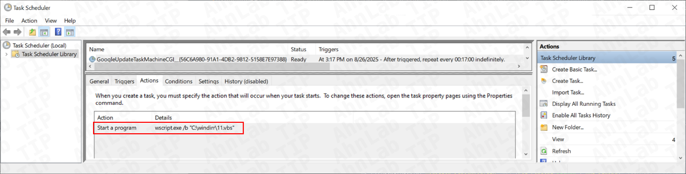 XML 파일을 기반으로 작업 스케줄러가 생성된다. 작업 스케줄러 이름은 GoogleUpdateTaskMachineCGI__{56C6A980-91A1-4DB2-9812-5158E7E97388}로 설정했다. XML 파일 내부에는 wscript.exe /b “C:\windirr\11.vbs” 명령어를 2025-08-26 15:17부터 17분 간격으로 계속 실행하는 작업 스케줄러가 정의돼 있다. 작업 스케줄러에 의해 11.vbs 파일이 실행되면 C:\windirr\pp.ps1 파일이 실행된다.