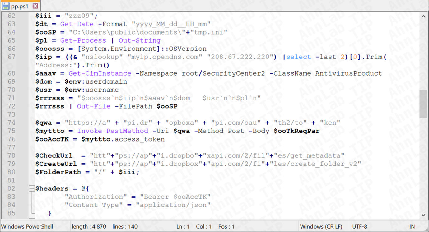 pp.ps1 파일은 C:\Users\Public\Documents\tmp.ini 파일을 생성한 뒤, [표 2]에 기재된 정보를 해당 파일에 저장한다. 공격자는 Dropbox 서비스를 정보 전송용 C2 채널로 사용했으며, 탈취된 정보는 <userdomain>_<날짜>_info.ini 형식의 파일명으로 업로드된다. 또한, 공격자 Dropbox 계정에 존재하는 zzz09_test.db_sent 파일을 다운로드해 C:\Users\Public\Music\hh.bat 경로에 저장한 후, cmd.exe /c C:\Users\Public\Music\hh.bat 명령으로 이를 실행한다.
