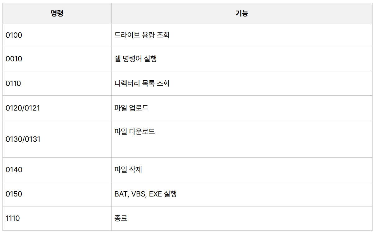 백도어는 C2 서버인 45.95.186[.]232:8080 “HAPPY” 문자열을 가진 패킷을 전송한다. 이는 감염된 사실을 알리기 위한 목적으로 추정된다. 이후 매직 바이트(0x99 0x0A 0xBD 0x99) 기반의 고정 크기(4096바이트) 커스텀 프로토콜로 통신하며, 명령 코드에 따라 다음과 같은 기능을 수행한다.