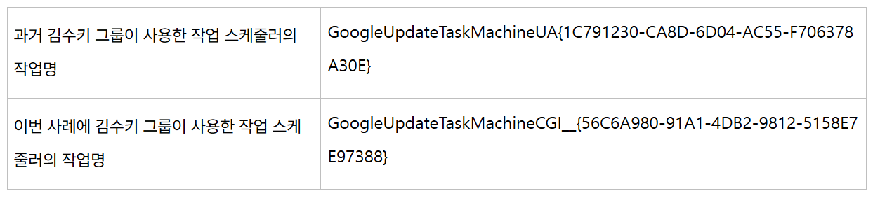 과거 김수키 그룹이 RAT 악성코드를 유포할 당시 사용했던 작업 스케줄러의 작업명과, 이번 백도어 유포 과정에서 사용된 작업 스케줄러의 작업명이 서로 유사한 점이 확인됐다.