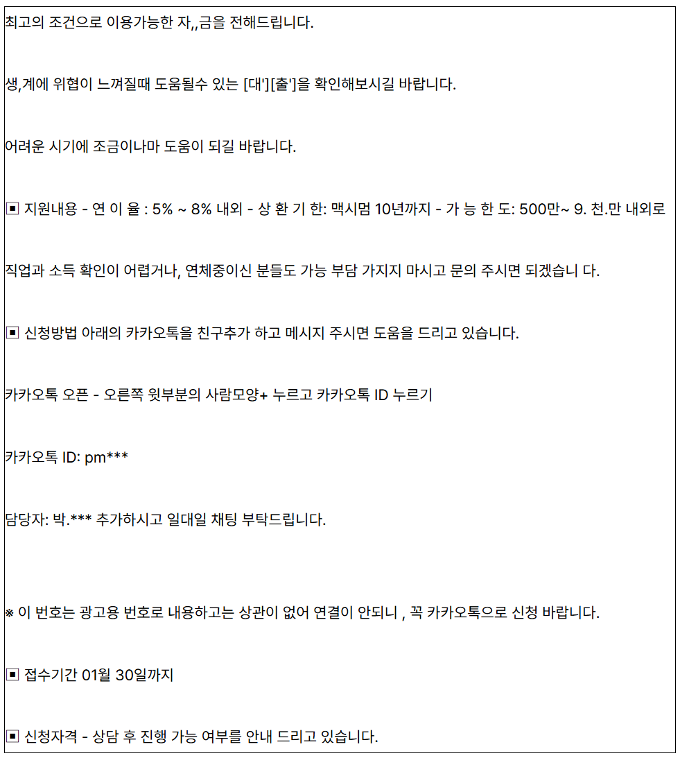 대출 사기형 스미싱은 저금리, 긴급 승인, 맞춤형 금융 지원과 같은 문구를 사용해 수신자가 특별한 금융 혜택 대상이 된 것처럼 인식하도록 한다. 실제 사례에서는 금리, 상환 기간, 대출 한도, 신청 자격과 같은 세부 조건을 길게 제시하고, 직업·소득 확인이 어렵거나 연체 중인 경우에도 가능하다고 안내해 절박한 상황에 처한 수신자의 관심을 유도한다. 또한 광고용 번호는 연결되지 않는다는 이유로 카카오톡을 통해서만 담당자와 상담하도록 유도하며 상담 흐름을 메신저로 집중시키는 특징을 보인다. 이후 메신저 상담으로 연결되면 개인정보 제공, 선입금 요구, 수수료 명목 송금 등으로 이어질 수 있다.