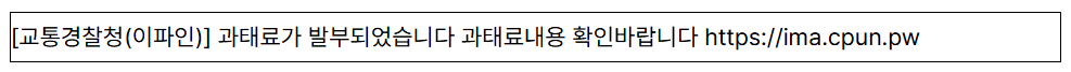 정부기관 사칭 유형은 공신력 있는 기관을 사칭해 과태료, 범칙금, 법규 위반 통지 등 즉시 확인하지 않을 경우 불이익이 발생할 수 있는 상황을 강조한다. 실제 사례에서도 교통경찰청이나 경찰청교통민원24(이파인) 같은 공공기관 명칭을 활용해 공식 안내처럼 위장한 뒤, URL 클릭을 유도하는 흐름이 확인됐다.