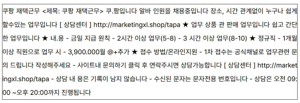 구인 사기형 스미싱은 재택근무, 고수익 아르바이트, 당일 지급 등의 문구를 활용해 경제적 관심을 자극하는 방식으로 접근한다. 근무 조건, 급여, 지원 절차를 상세히 제시해 정상적인 채용 공고처럼 보이도록 구성돼 있으며, 상담센터 URL을 반복적으로 노출해 자연스럽게 클릭을 유도한다.