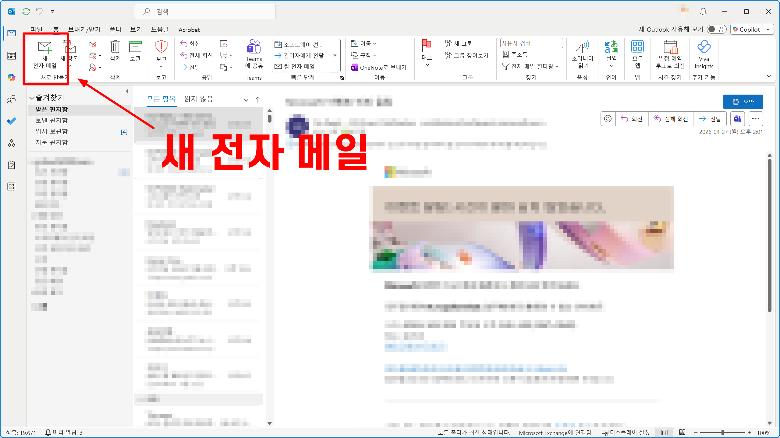 아웃룩을 실행한 뒤 [새 전자 메일]을 클릭합니다.