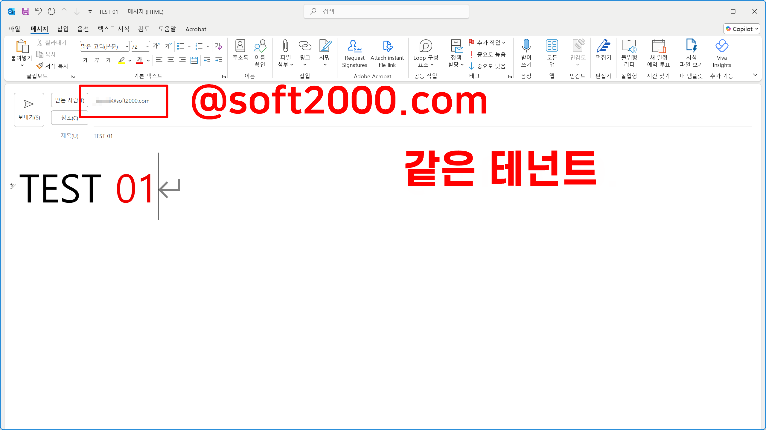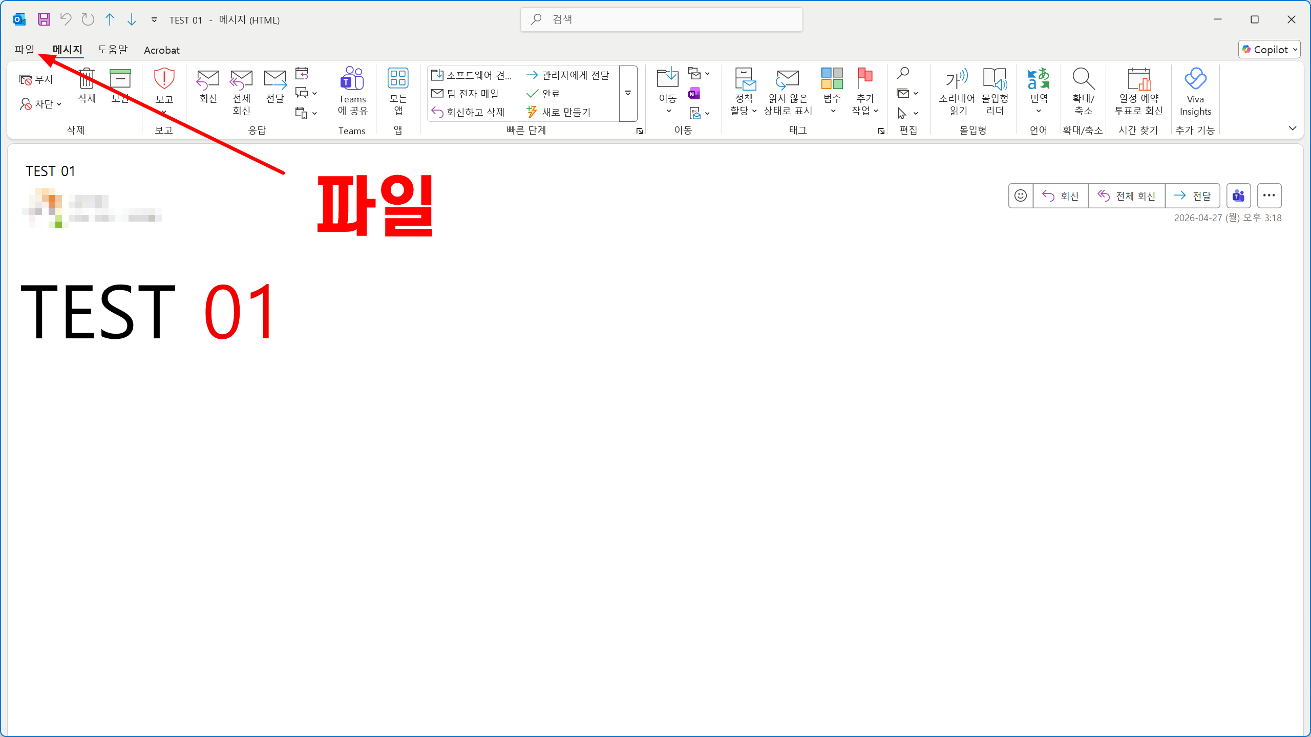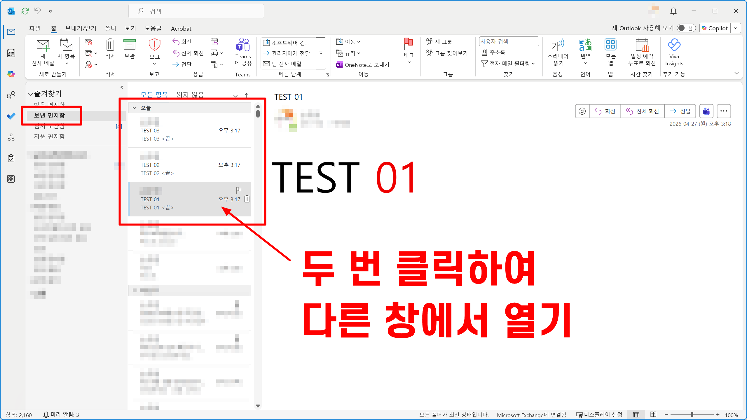 그중 TEST 01 메일을 두 번 클릭하여 다른 창에서 엽니다.