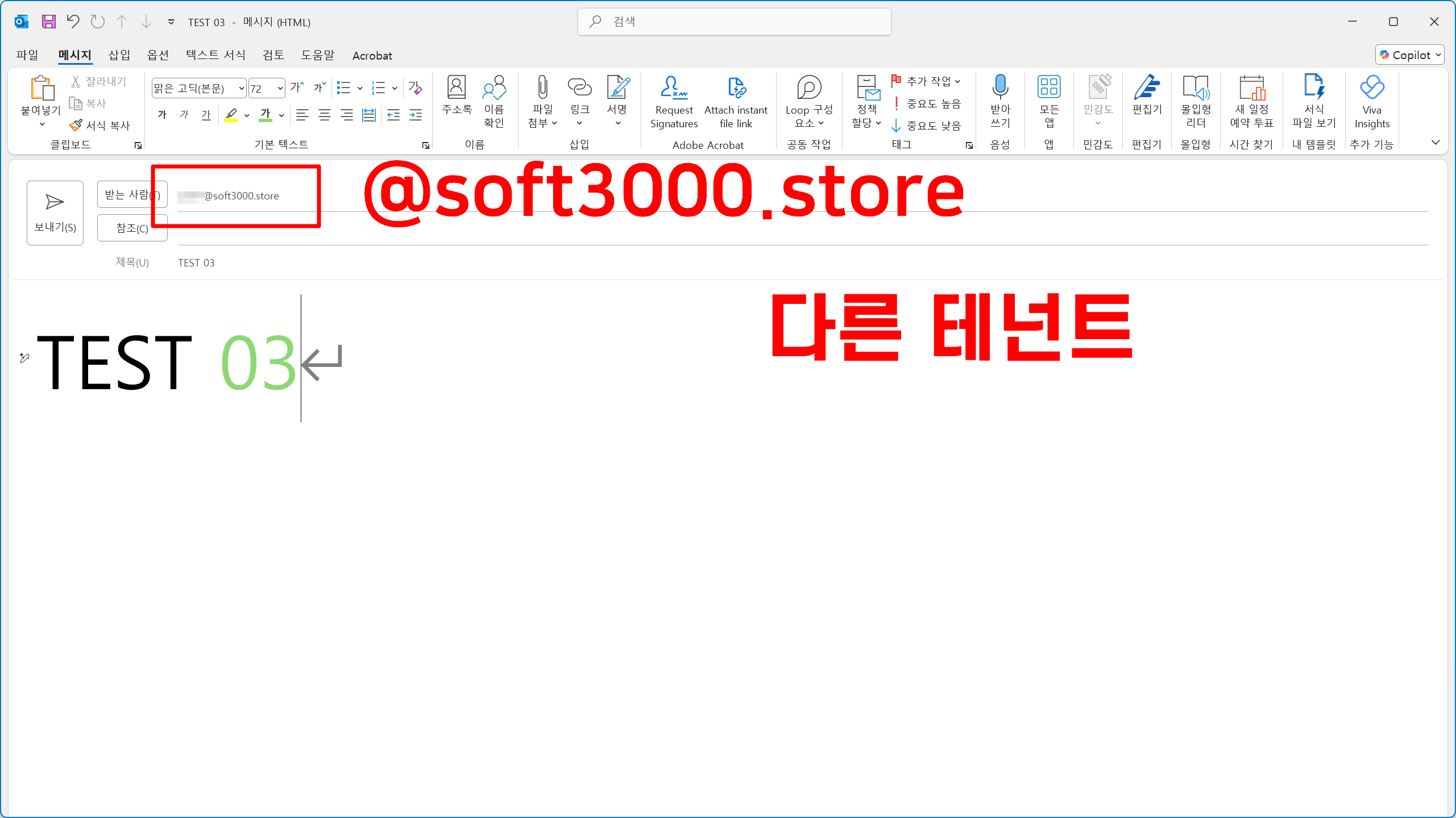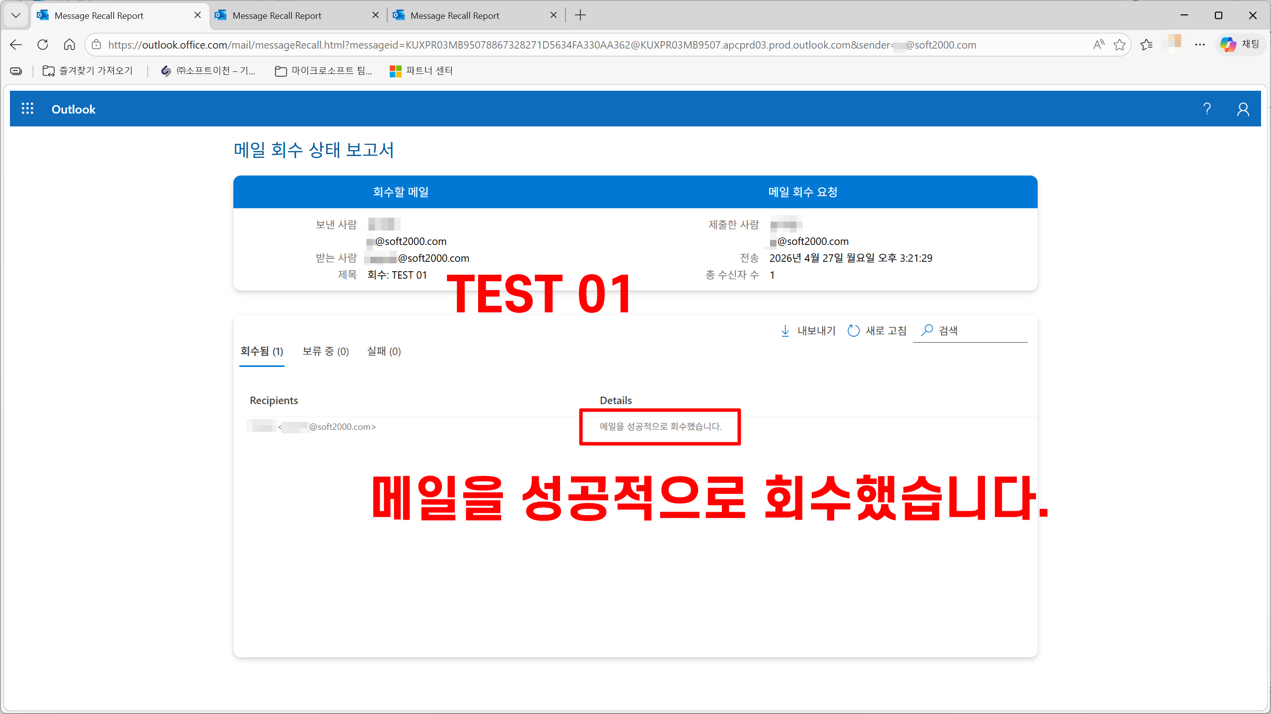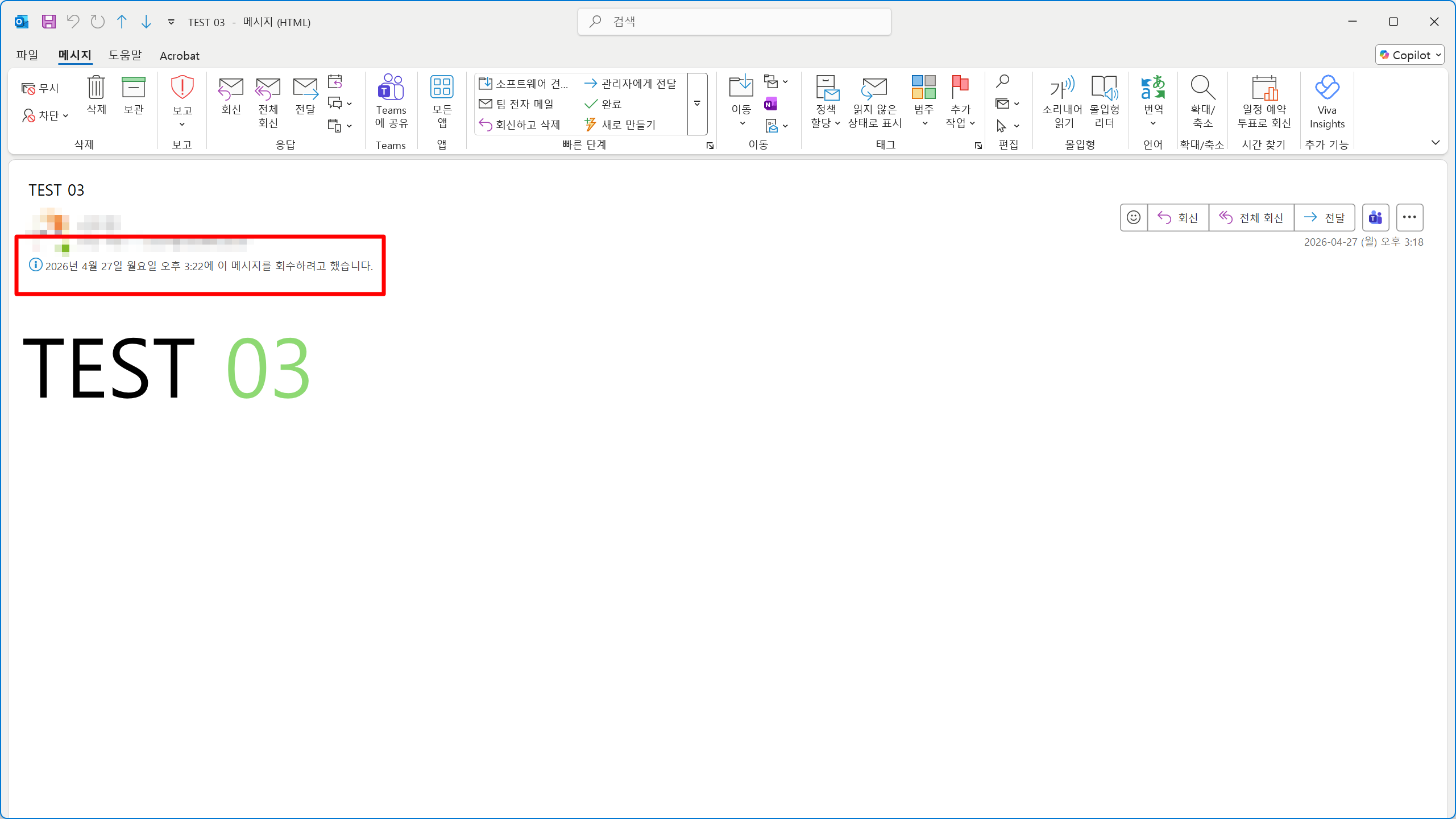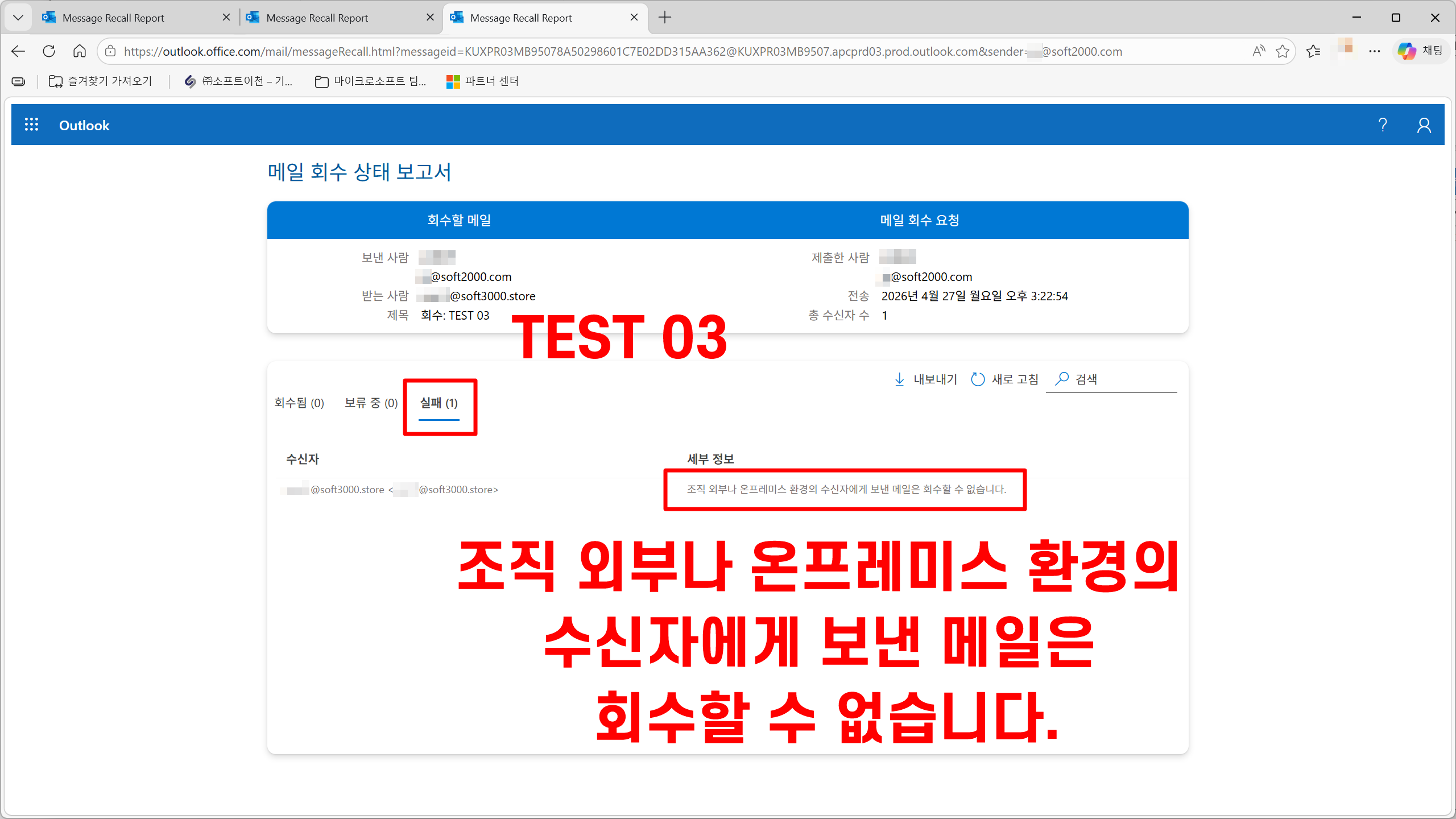 TEST 03외부 테넌트 수신자에게 보낸 메일로, 아웃룩 메일 회수 기능을 사용할 수 없어 회수에 실패했습니다.
