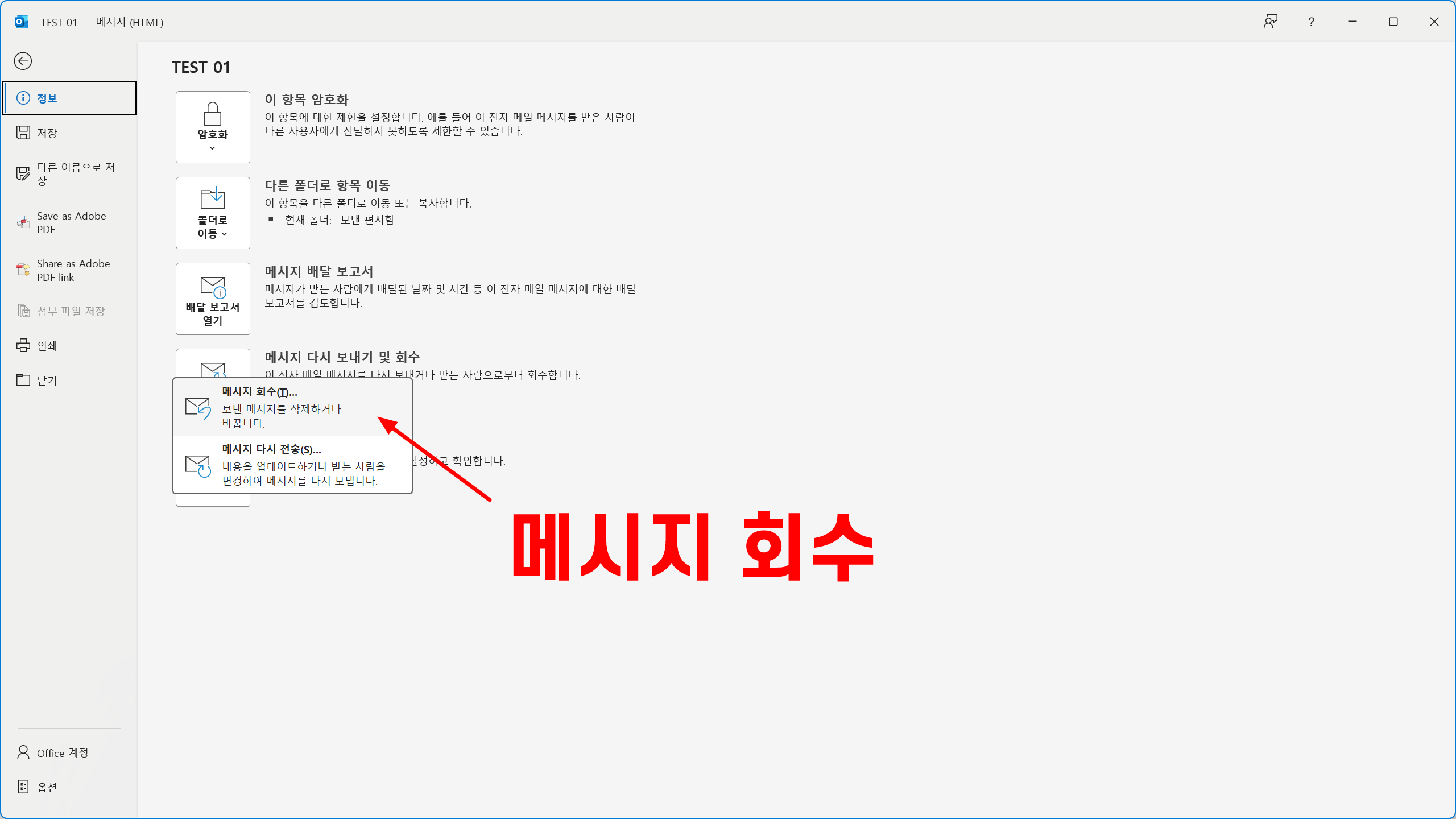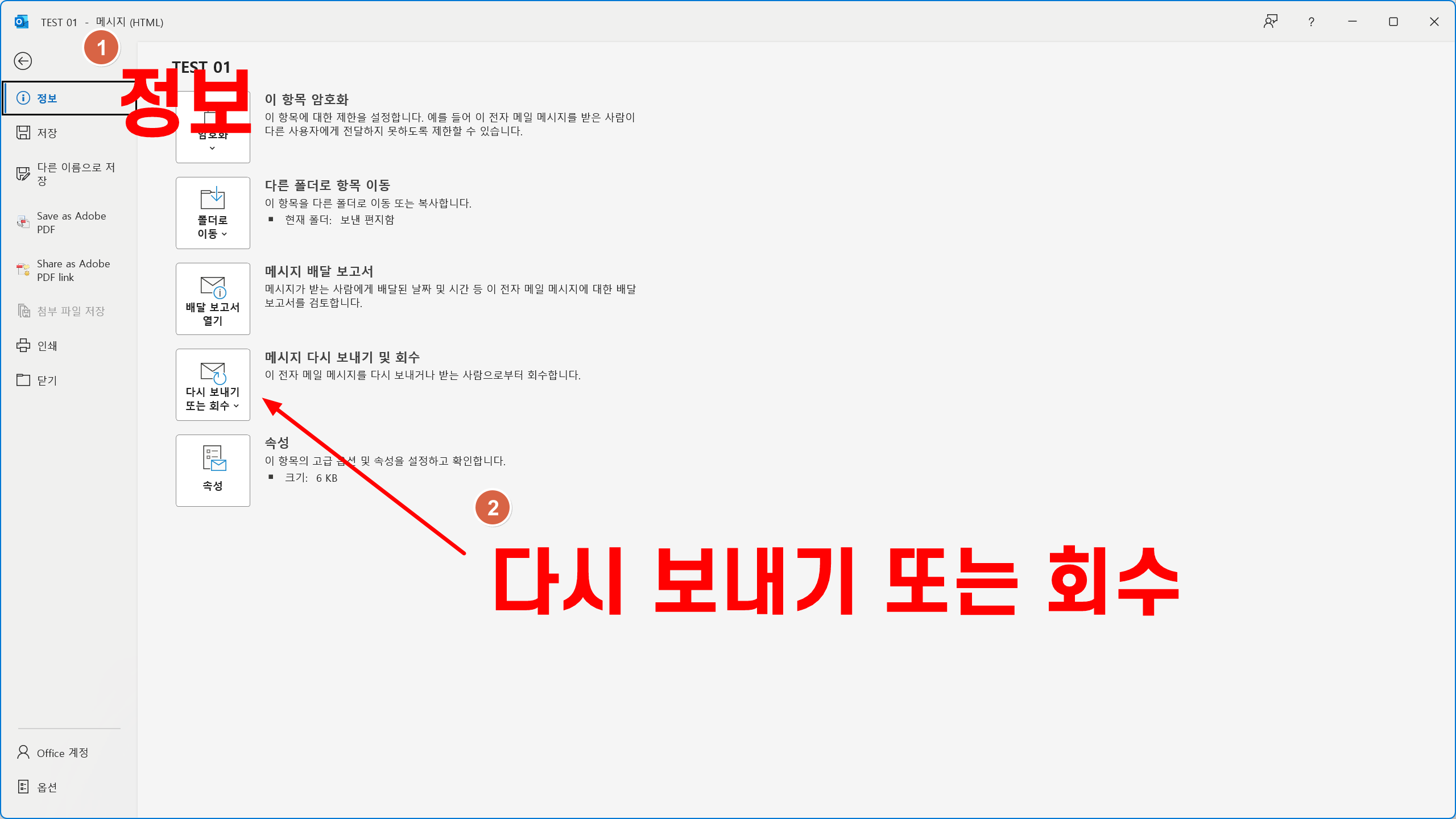 [정보] > [다시 보내기 또는 회수]를 클릭합니다.