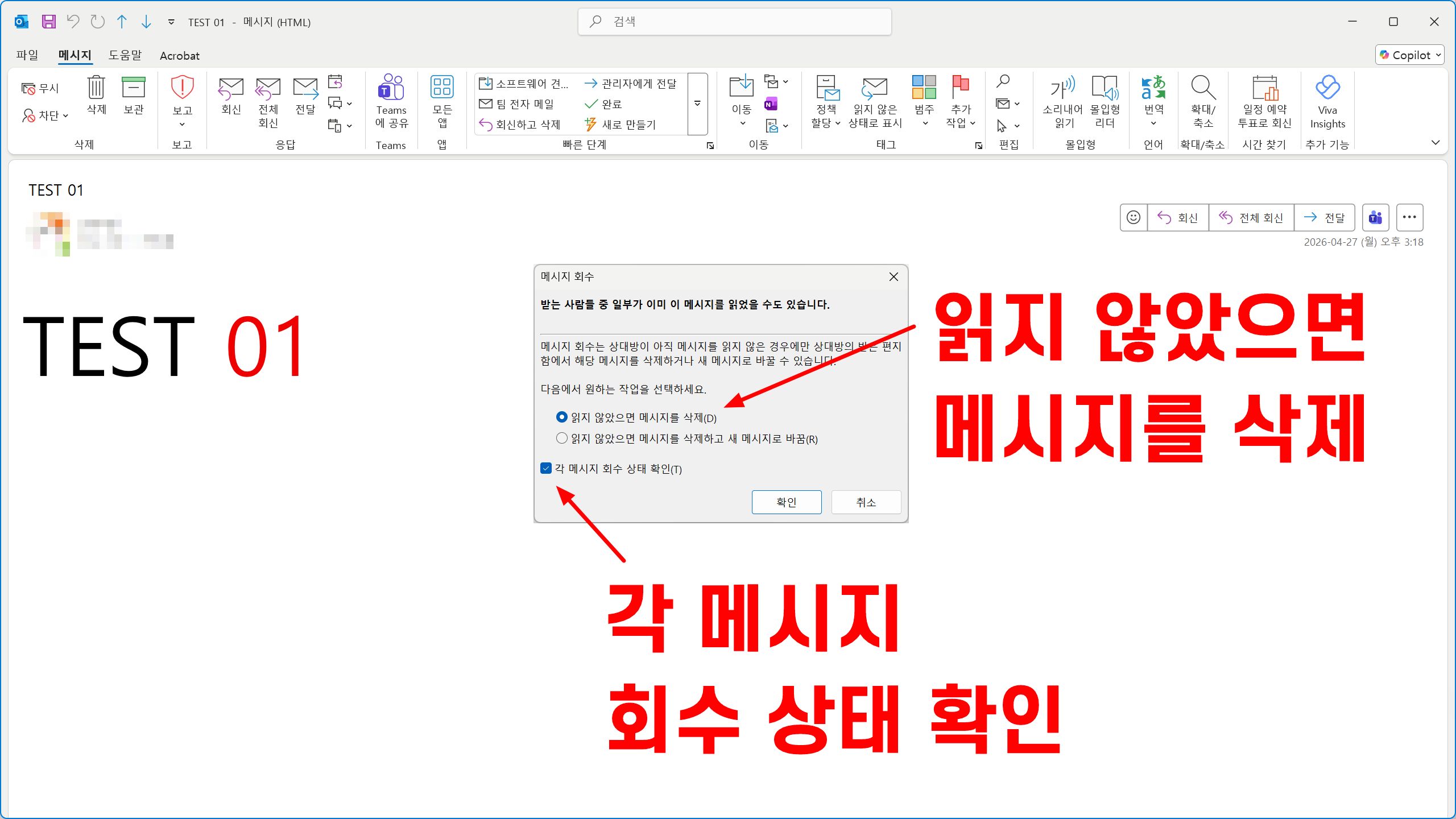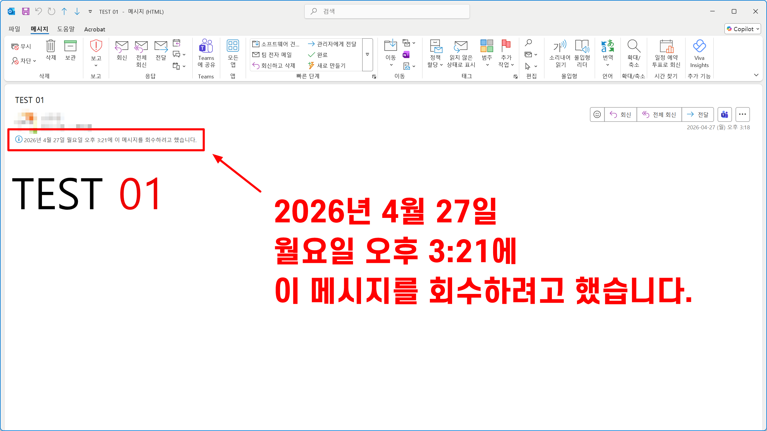 2026년 4월 27일 월요일 오후 3시 21분에 이 메시지를 회수하려고 했습니다. 라는 안내 문구가 표시됩니다.