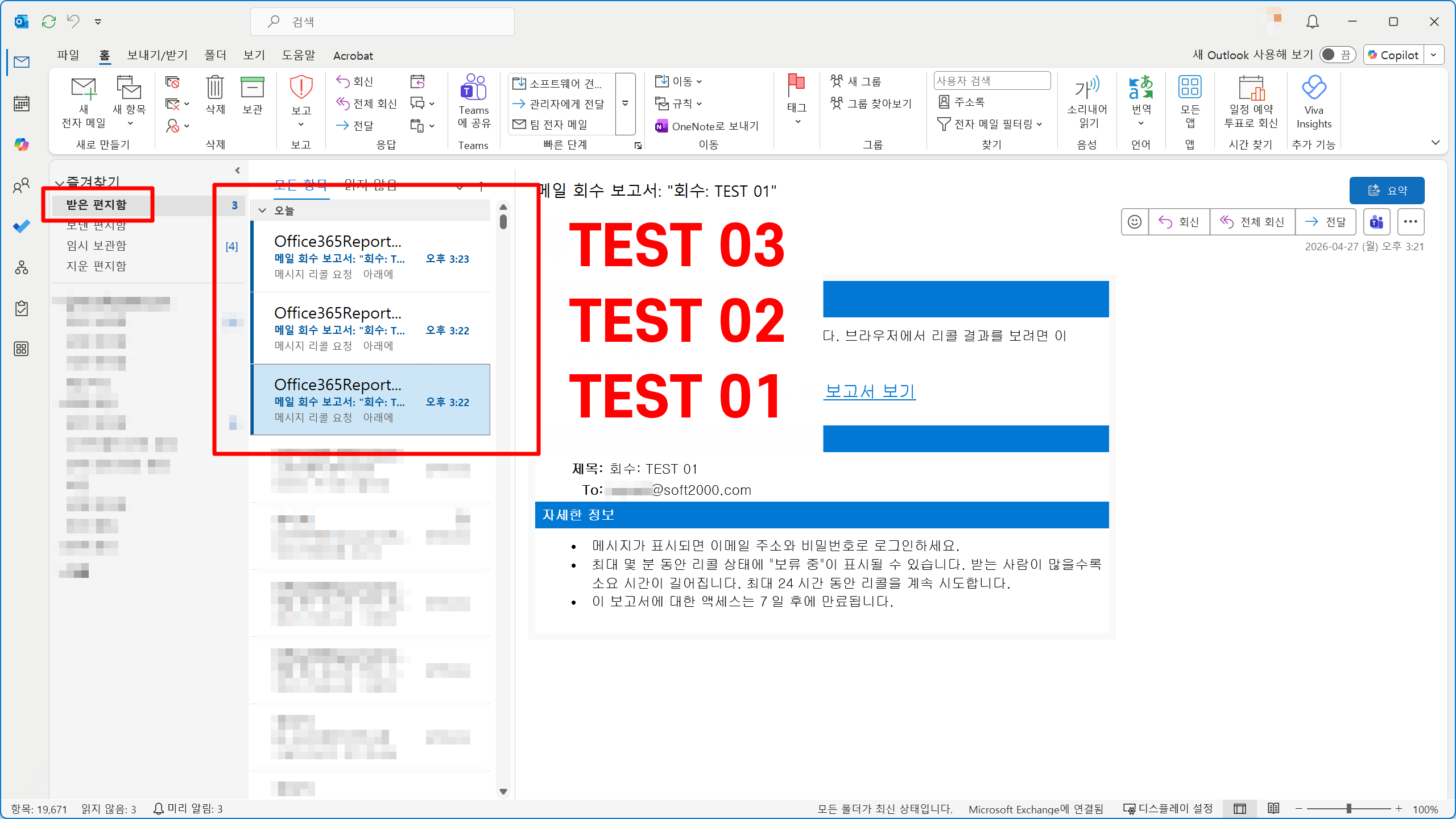 • TEST 03 메일만 외부 테넌트로 구분됩니다.