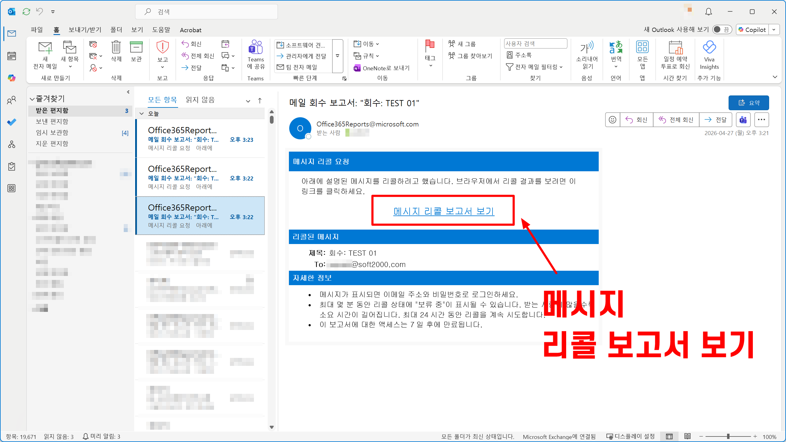 [메시지 리콜 보고서 보기]를 클릭하면...