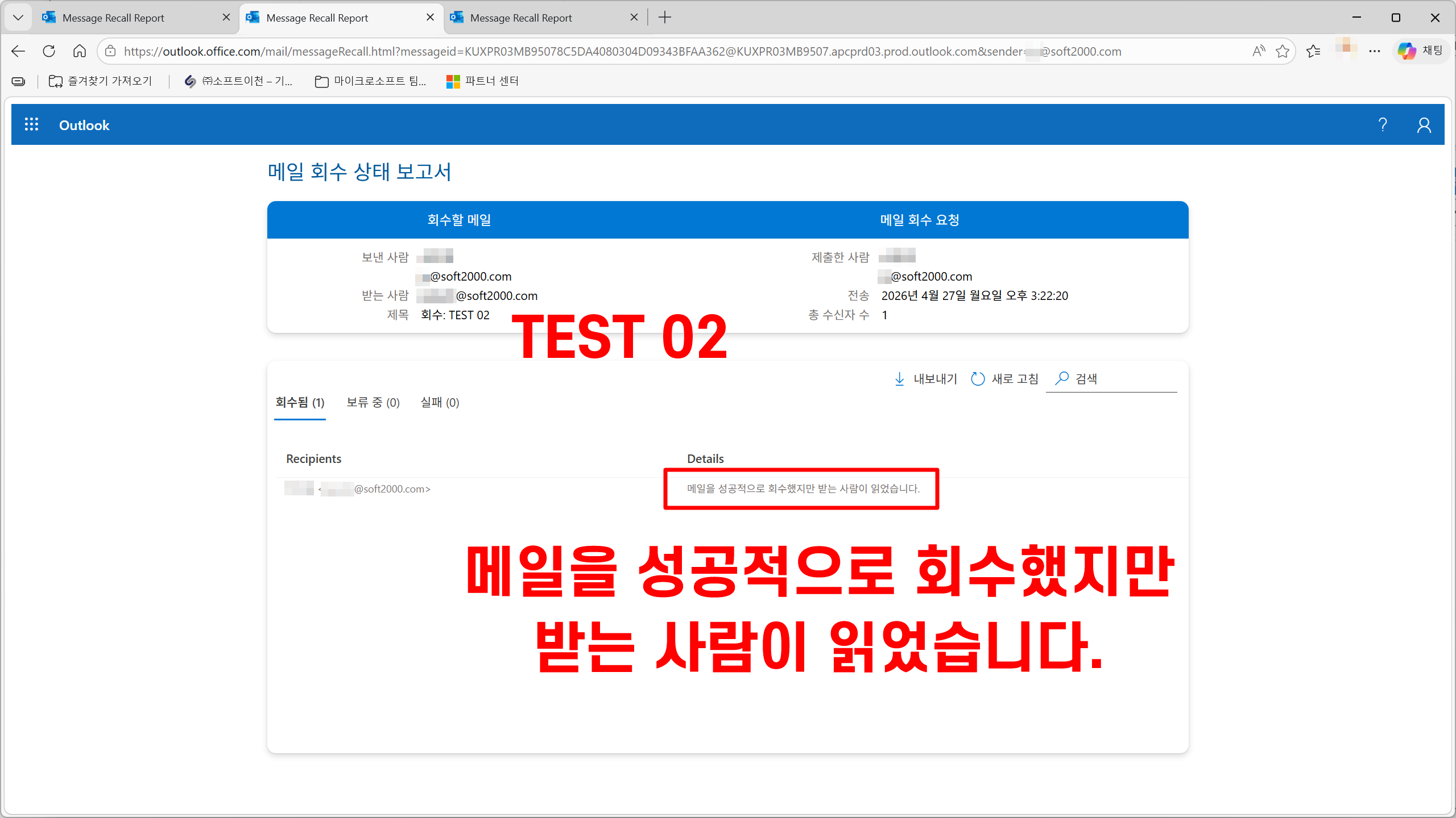 TEST 02는 메일 회수 자체는 성공적으로 완료되었으나, 수신자가 이미 메일을 읽은 상태였습니다.